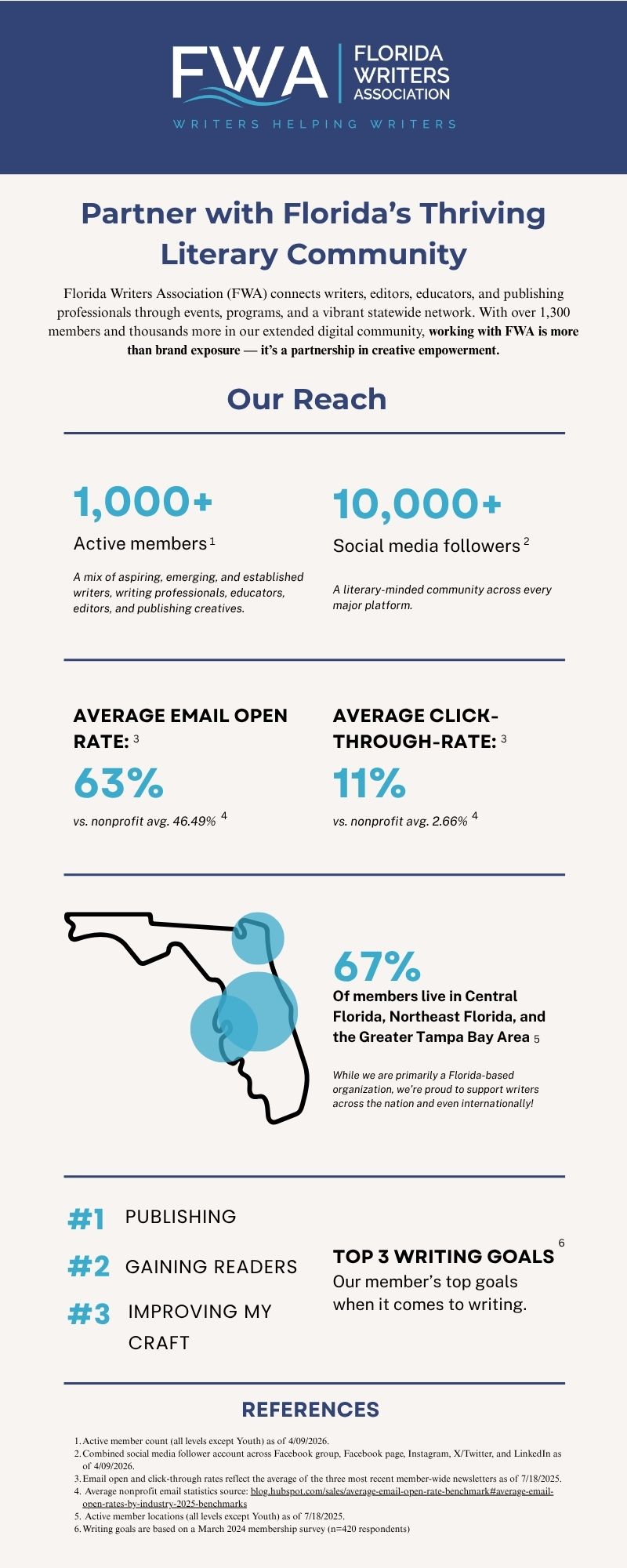 Florida Writers Association (FWA) connects writers, editors, educators, and publishing professionals through events, programs, and a vibrant statewide network. With over 1,000 active members and thousands more in our extended digital community, working with FWA is more than brand exposure — it’s a partnership in creative empowerment.
